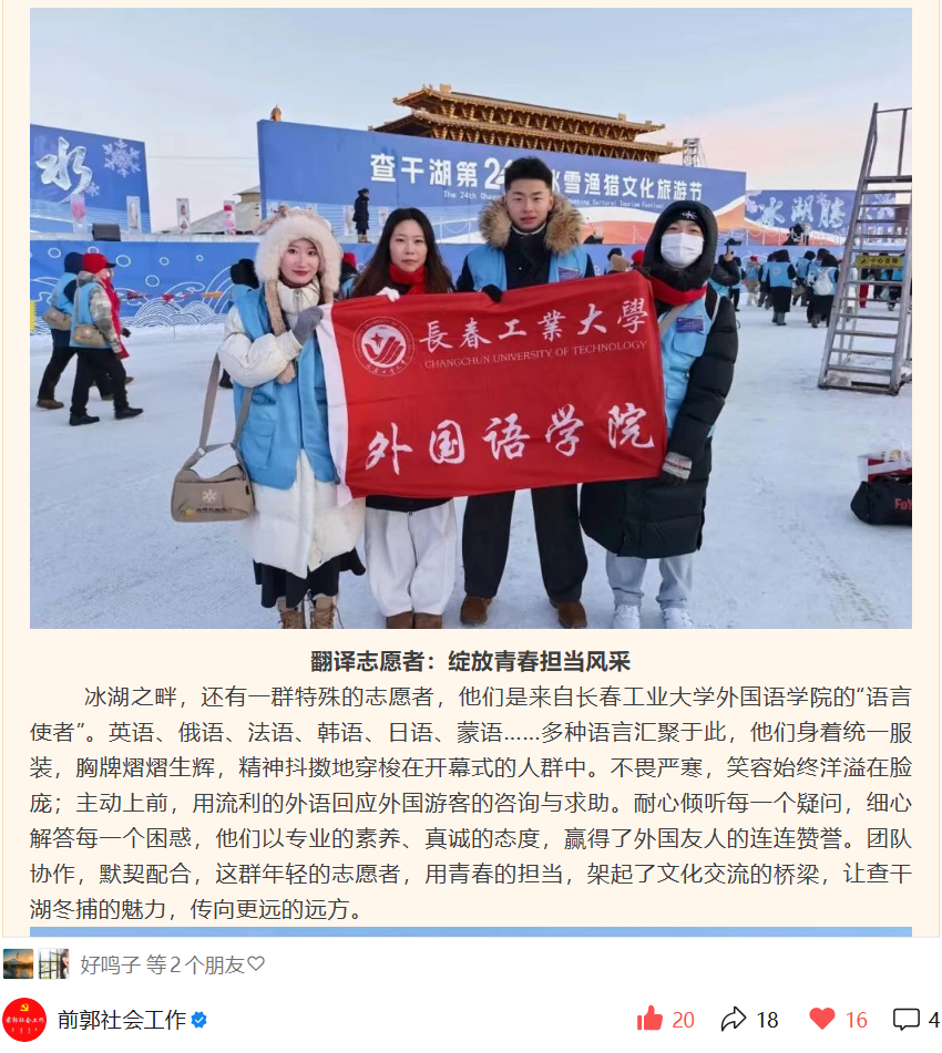 查干湖畔寒风凛冽,但志愿者们的笑容始终洋溢在脸庞。他们不畏严寒坚守岗位,耐心倾听每一个疑问,细心解答每一个困惑,无论是关于冬捕历史的溯源、民俗风情的解读,还是游览路线的指引、现场需求的响应,都以专业的素养、真诚的态度高效回应,用实际行动赢得了外国友人的连连赞誉。这群年轻的志愿者,不仅将课堂所学的语言知识转化为服务社会的实际能力,更以青春的担当架起了文化交流的桥梁,让查干湖冬捕的独特魅力传向更远的远方。