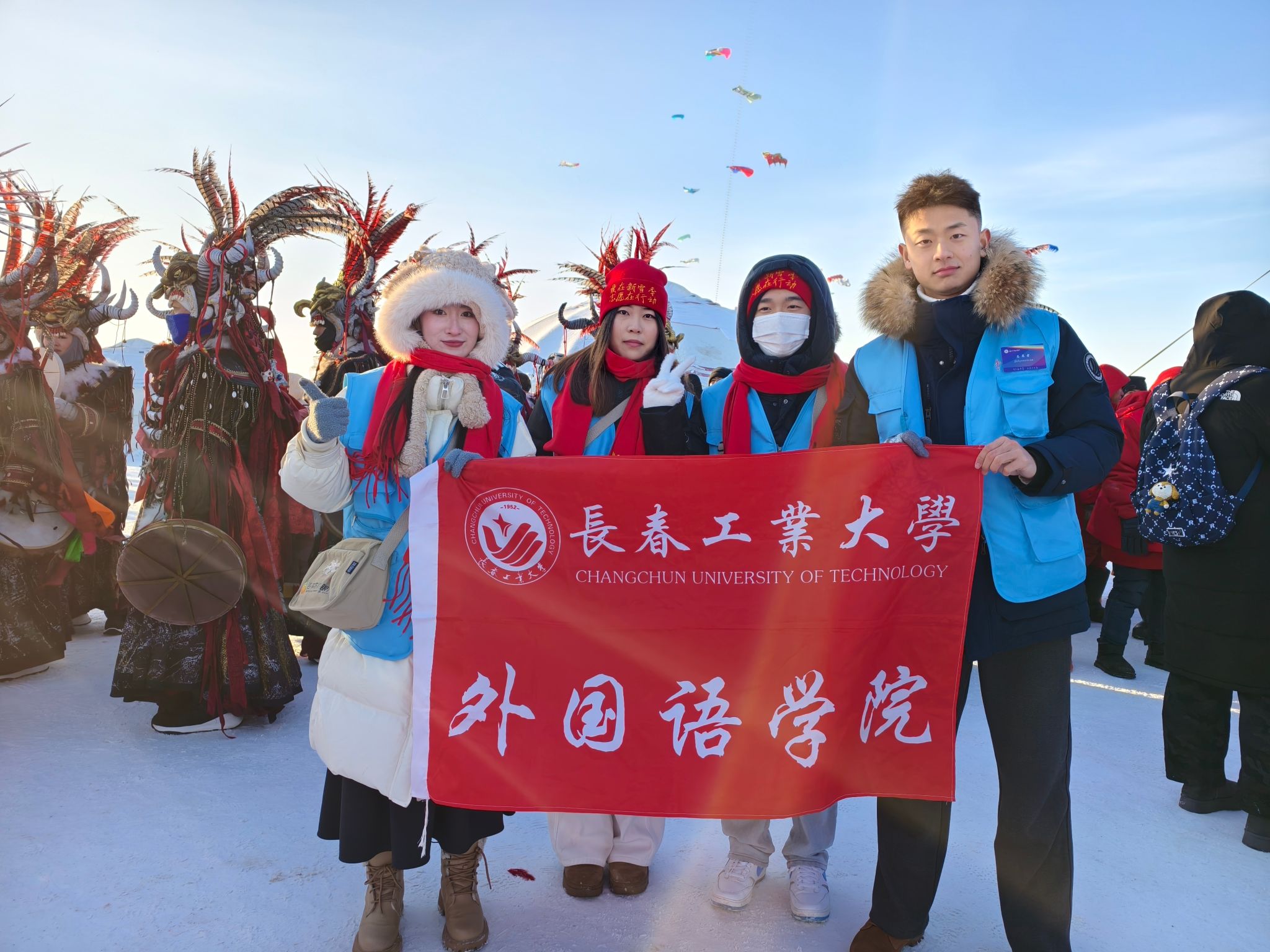 查干湖冬捕承载着辽金以来的渔猎文明,本届旅游节不仅延续了“祭湖·醒网”等传统仪式,更创新推出沉浸式演艺、特色冰雪运动、互动体验项目等多元内容,让中外游客深度感受冰雪魅力与民俗风情。盛会现场,我院多名志愿者化身文化交流的纽带,全程参与翻译服务工作,以扎实的语言功底和饱满的热情投入志愿服务。
