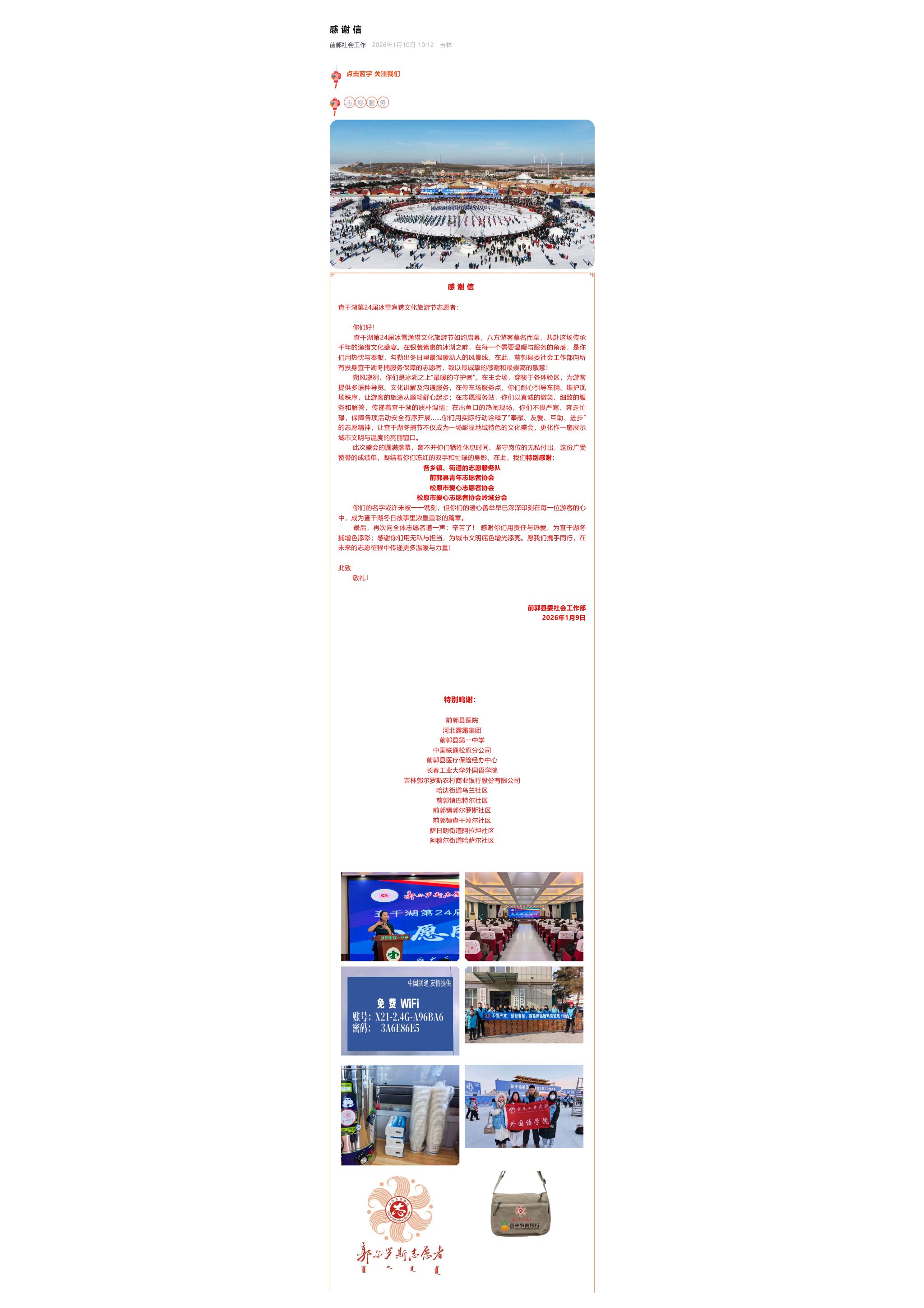 本网讯(通讯员 金一鸣)为深入落实学校“三访三促”工作相关部署,推动实践育人与地方发展深度融合,学院主动对接松原市相关部门,精心选拔优秀学生承担多语种语言志愿服务工作。1月8日,我院学生投身查干湖第24届冰雪渔猎文化旅游节开幕式,以专业翻译能力为盛会助力添彩,相关事迹获松原市官方媒体报道,学院收到相关部门的感谢信。
